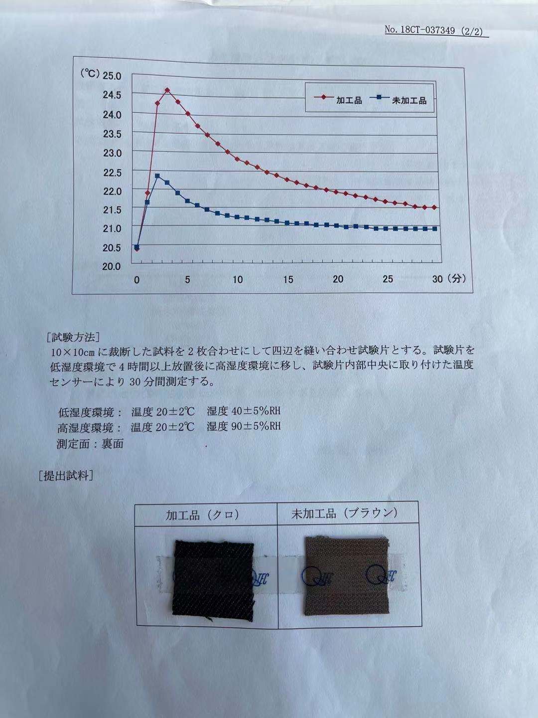 采用特殊工艺的吸湿发热再生纤维素纤维,以其特殊的扁平断面,优良的吸湿性能,使其发热的效果远远好于普通的天然纤维和合成纤维,配合保暖性能优异的晴纶纤维,面料发热,保暖,保湿多重效果。